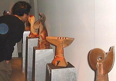 Upon entering the gallery I was met by a row of five pieces all with cylindrical bodies set on a wide base with attached appendages at the head. They were like a receiving line for all guests during the one-week exhibition.
