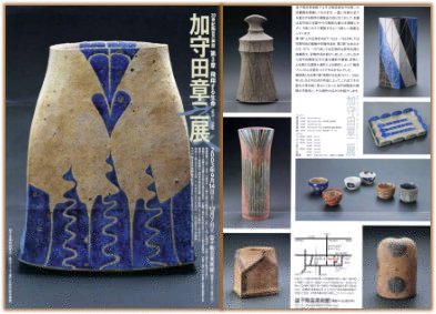 His work is the antithesis of what many perceive Japanese ceramics to be -- load pots in a kiln and ask the kiln gods to bless them with accidental (but beautiful) kiln mutations. Kamoda knew well in advance how he wanted his works to look after firing. His is one of the keenest Japanese artistic senses ever expressed in clay: wavy, multicolored enamel lines; stained glasslike patchwork segments; coarse clay inlaid with delicate enamels; and gaunt, edgy, arabesque-looking designs.