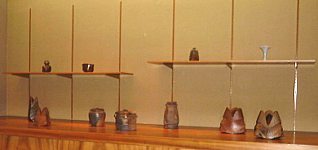 When I visited there was a three-part, three-person exhibition entitled Tora, Tora, Tora. Now don't start thinking of famous war movies - not that at all. Tora, in this case, means Tiger, and the three potters, Bizen's Kakurezaki Ryuichi and Kaneshige Yuho, plus celadon specialist Kawase Shinobu, were all born in 1950 - The Year of the Tiger. This particular exhibition had three parts; tea forms, sake utensils, and sculptural forms.