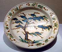 The pine tree -- matsu -- has always been a popular motif on Karatsu wares. It is a symbol of prosperity, strength and longevity. The exhibition offers whole rows of large, wide-mouthed kame with gnarled matsu painted in exaggerated sweeps of the painter's brush. Many are cracked from centuries of common use holding water, sake and sauces. It's these kame and platters that stand out in the exhibition -- although there are many other forms and styles to admire.