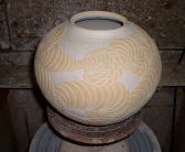 It is very detailed work that takes about one week to create, from throwing to the final carvings. He adds a shibui ("refined") green glaze by compressor and fires for about 30 hours in a gas or electric kiln. He also fires Tenmoku and Shino-esque works. Just because it's made in Kasama, can it be called Kasama-yaki? I don't think so.