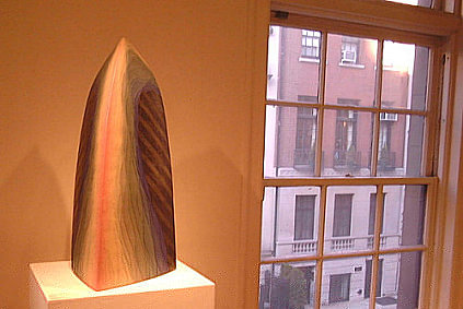 Miyashita recently displayed his work in New York City. Among his pieces, one large triangular piece with a brilliant display of color had an abrupt contrast over the side in diagonal stripes of silver and black; a stunning piece.