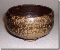 There were dozens of works on display, most for sale, by both. I must admit I prefer Suzuki's work of about five years ago or earlier than to what he's doing now. This holds mostly true for his chawan and shuki (sake vessels). Indeed, his chawan are a joy to view -- but what a load to hold; bulky, heavy, and with huge kodai that look like flattened donuts. I must say I've never tried drinking from one and my mind may change upon doing so, yet for the time being my preference is with his chawan of some years back. The below yashichida (a lively Oribe style) chawan is a case in point.